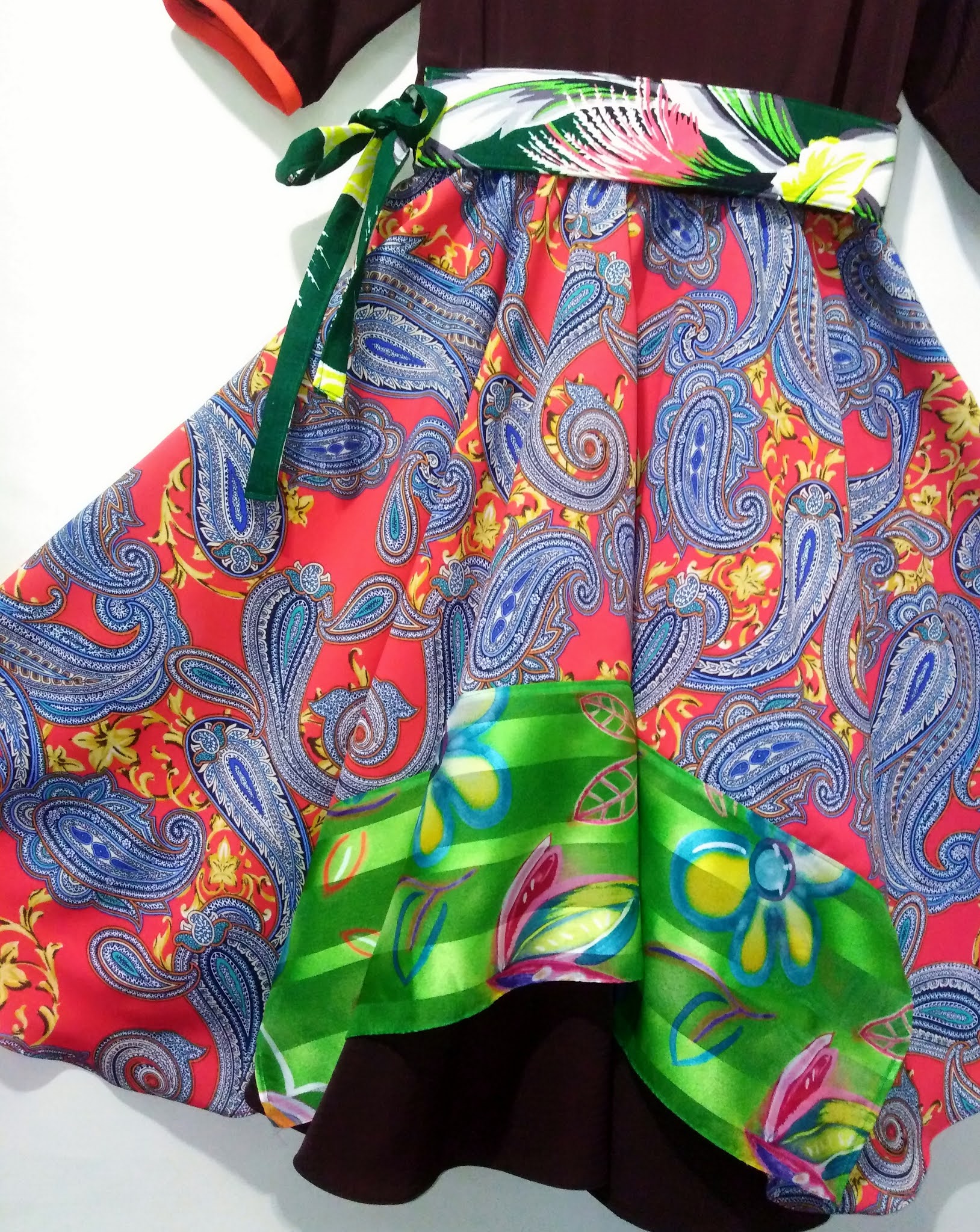 Fuste cloș asimetrice suprapuse, cea de dedesubt aidoma părții de sus, cea de deasupra din voal plin de vâscoză (motive Paisley în nuanțe albăstrii pe fundal corail) și mătase înflorată (identic la spate).
